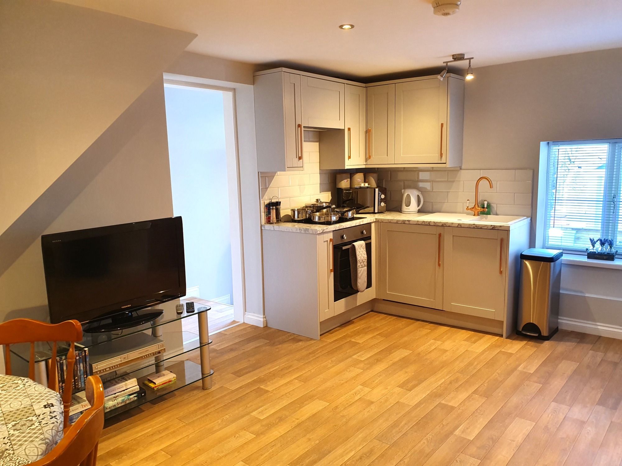 Kitchen area: With electric oven, electric hob, microwave and fridge/freezer.